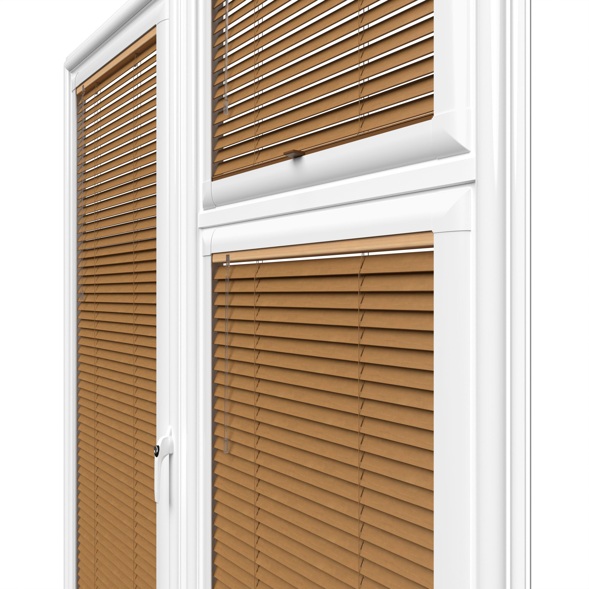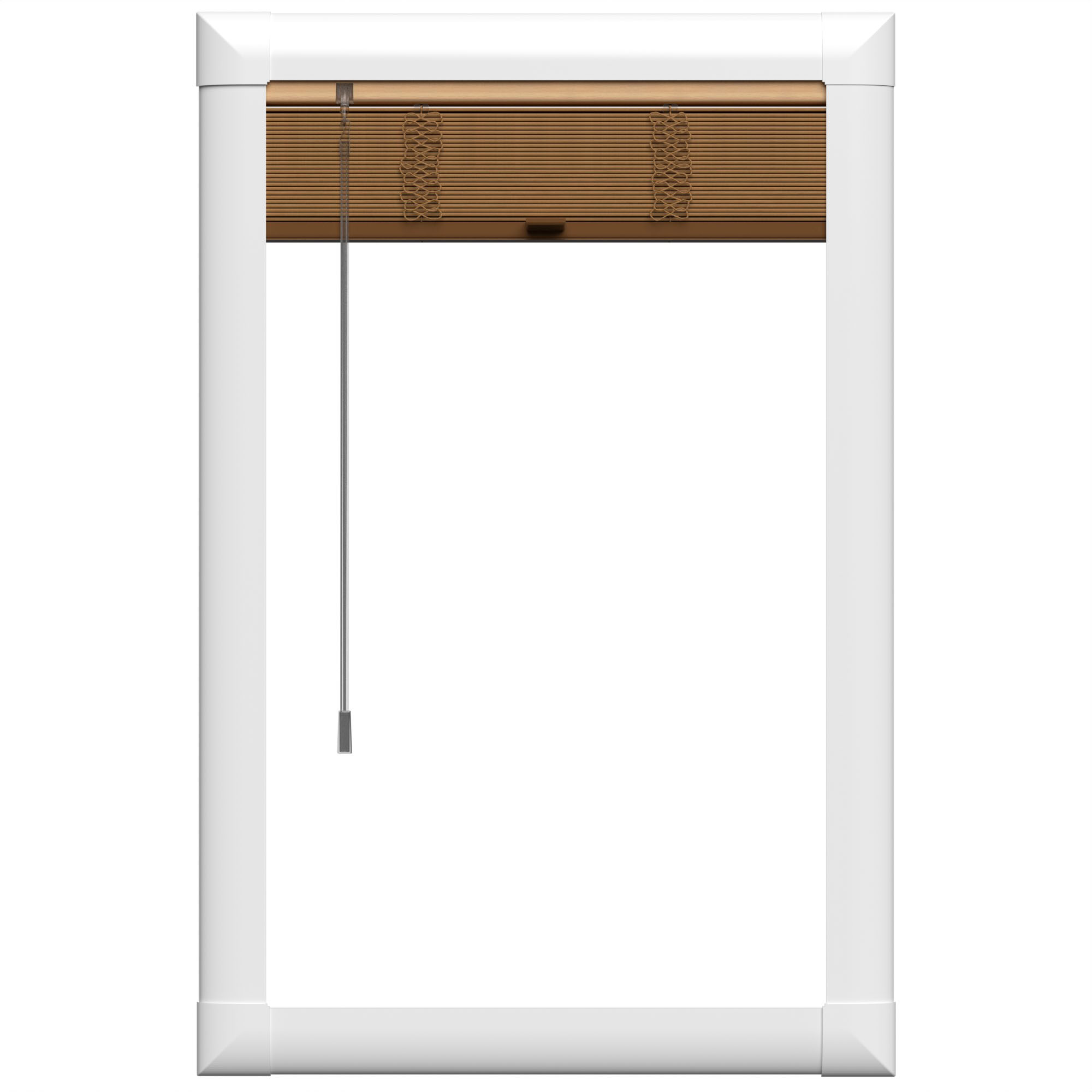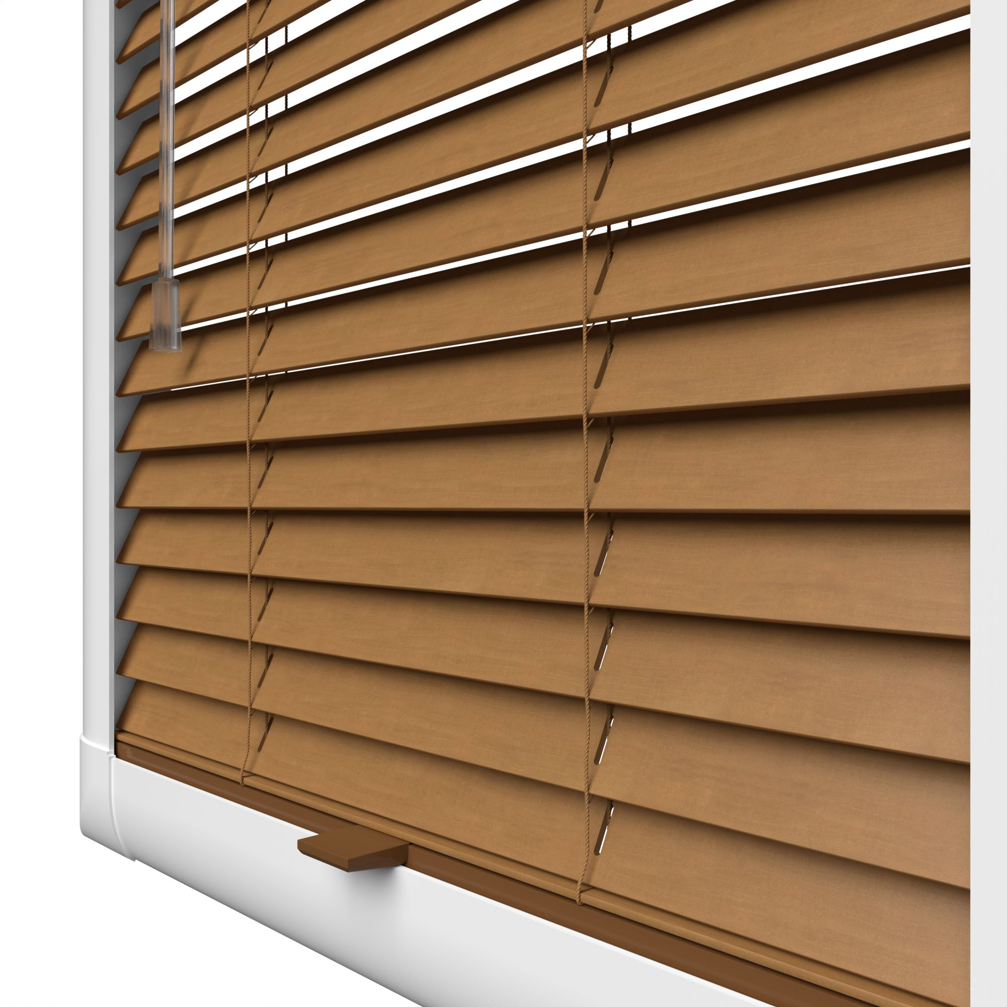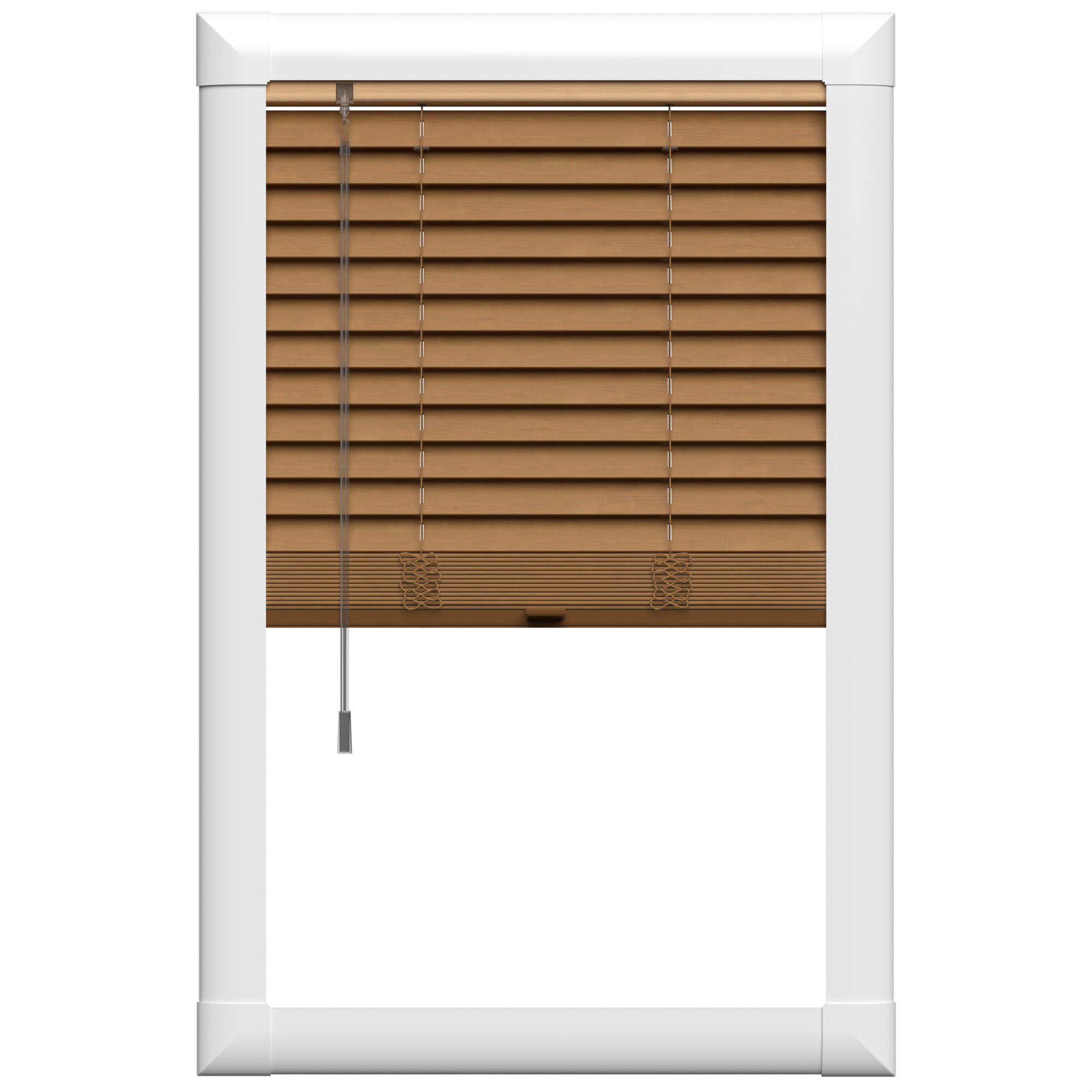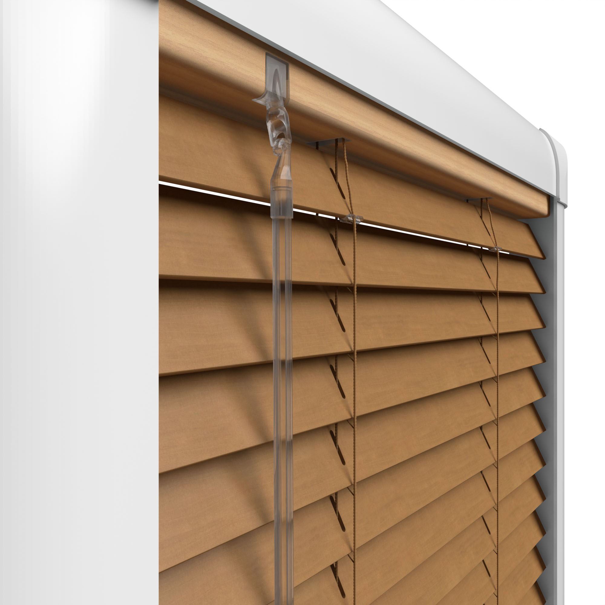 Inside the Perfect Fit frame the blind uses a colour co-ordinating light brown headrail and a tan bottom bar, with a clear operating handle and control wand