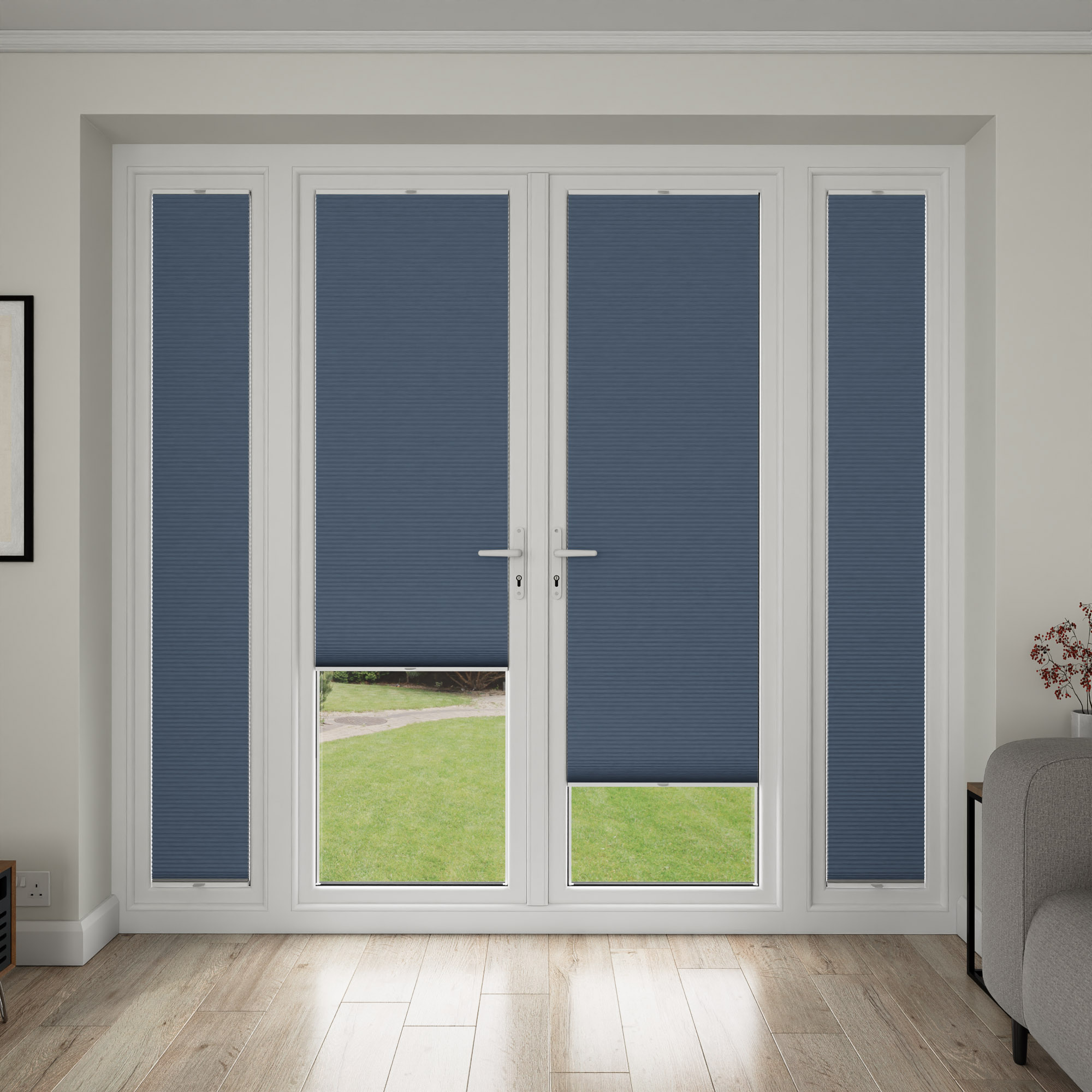 Please note that our StickFit blinds project 35mm from the glass to the front of the folded down operating handle. The is particularly important to note for bi-fold doors and their operation.